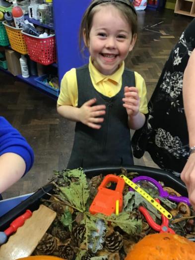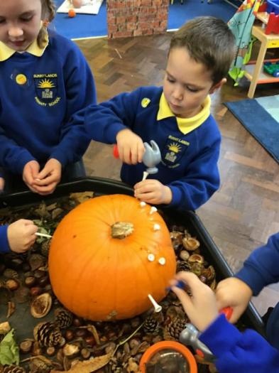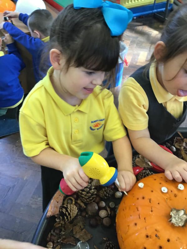 Our new topic has been keeping us very busy and has allowed us to get outside lots to investigate objects that can be found in this new season. Last week we learned all about the book 'Leaf Man' going on a leaf hunt, sorting leaves into their relevant colours, making our very own leaf men and making lots of patterns. This week we have been reading the Big Book, 'Owl Babies' and have been learning about what owls eat, how they live in a nest and how they hatch out of an egg whenever they are babies called Owlets. In the playroom we have been making coloured patterns using a carrot (instead of a sponge), making Halloween soup and investigating Pumpkins. We have worked very hard in our finger gym to eventually cut these pumpkins open to investigate what can be found inside!!