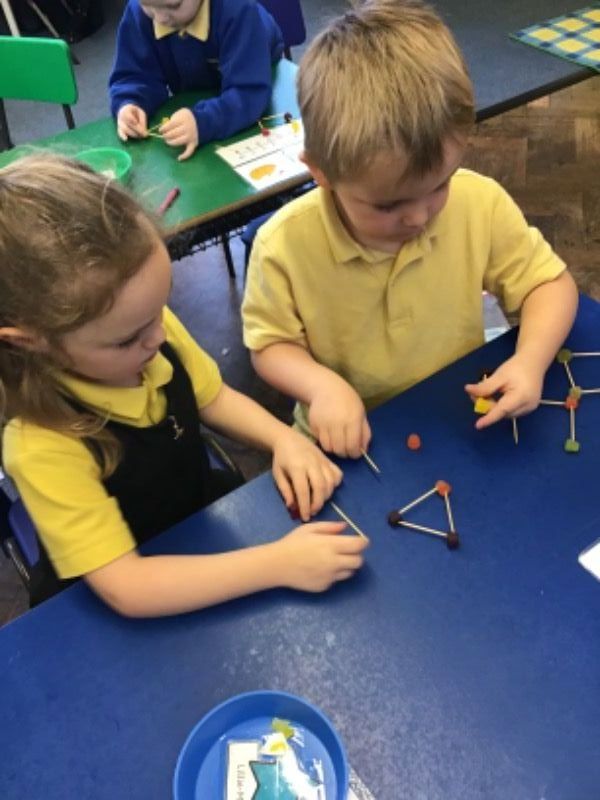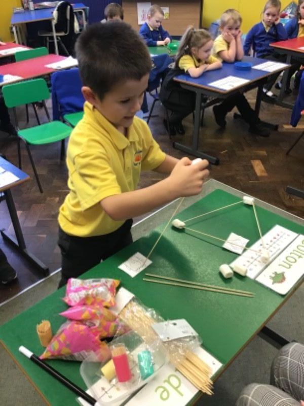On Friday to finish off our work on 2D shapes we used our STEM skills to make our own shapes using cocktail sticks and midget gems. Mrs Walsh used skewer sticks and marshmallows and we used our own smaller versions. Some of us were able to make shapes as tricky as rectangles and hexagons and took them to show Mr Smyth the whole way up in primary six, he was very proud of our work in primary one. Have a look and see what we got up to.