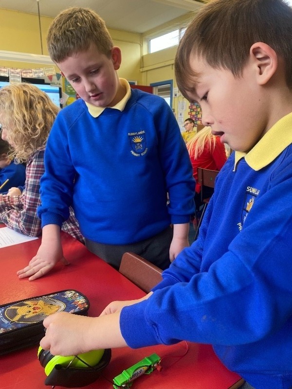 Using a simple circuit, they tested a range of objects around the classroom. They identified the material the object was made from before checking whether the bulb would successfully light. 💡