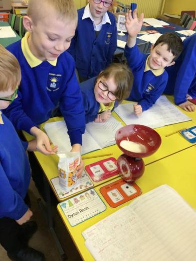 We looked at the recipe for pancakes and carefully measured out the ingredients we needed. Then Miss McConkey cooked them for us! They were delicious!