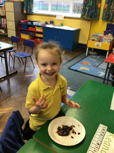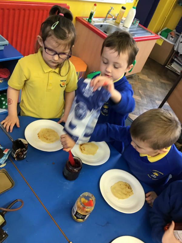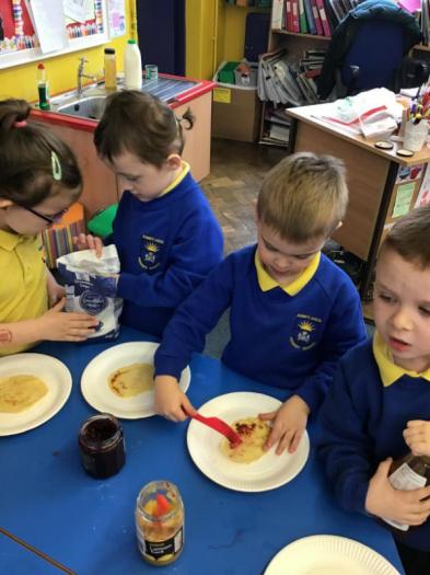 We then worked in our groups to help Miss Donnell cook our pancakes on a hot pan before adding our very own toppings all by ourselves. There were lots of toppings; raspberry jam, chocolate chips, chocolate spread, lemon sauce, sugar and butter. We then got to eat our very own pancakes - they were YUMMY!