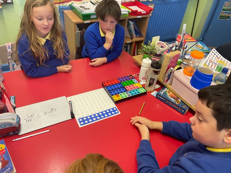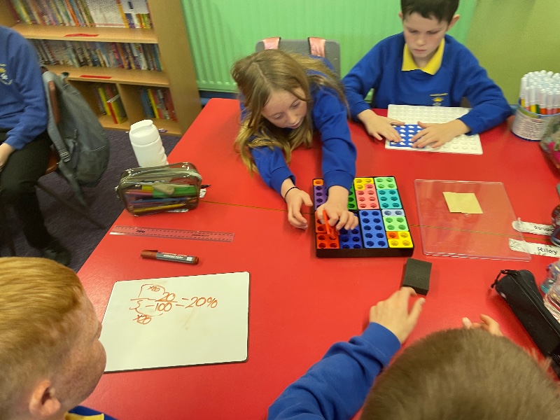 We used Numicon explore this connection between percentages and fractions today in maths. We had to use the numicon to cover a certain percentage of the baseboard, then we had to work together to write it as a fraction in its simplest form. We learnt that fractions are ALWAYS measured out of 100, and this helped us when we were working to simplify fractions!